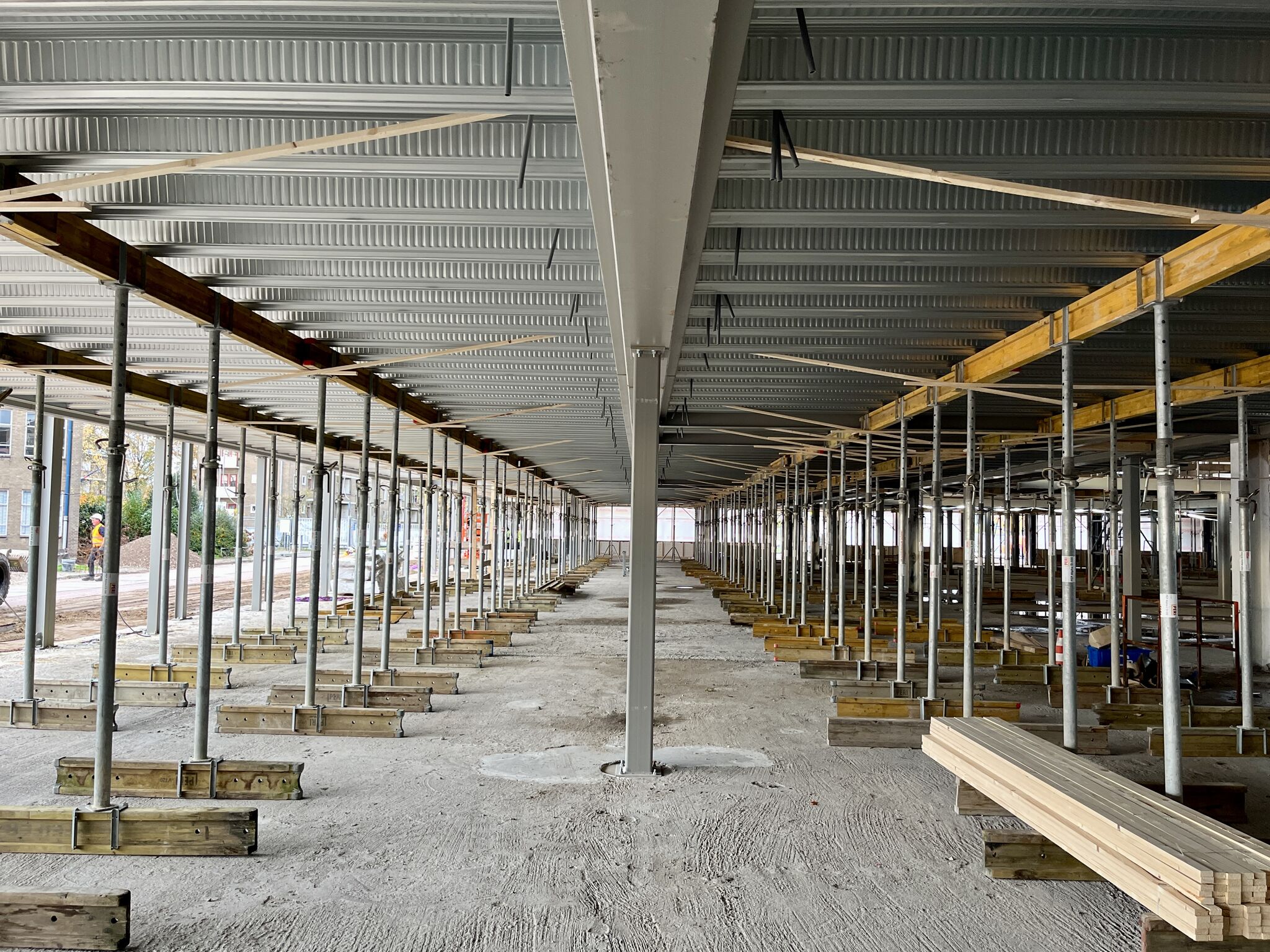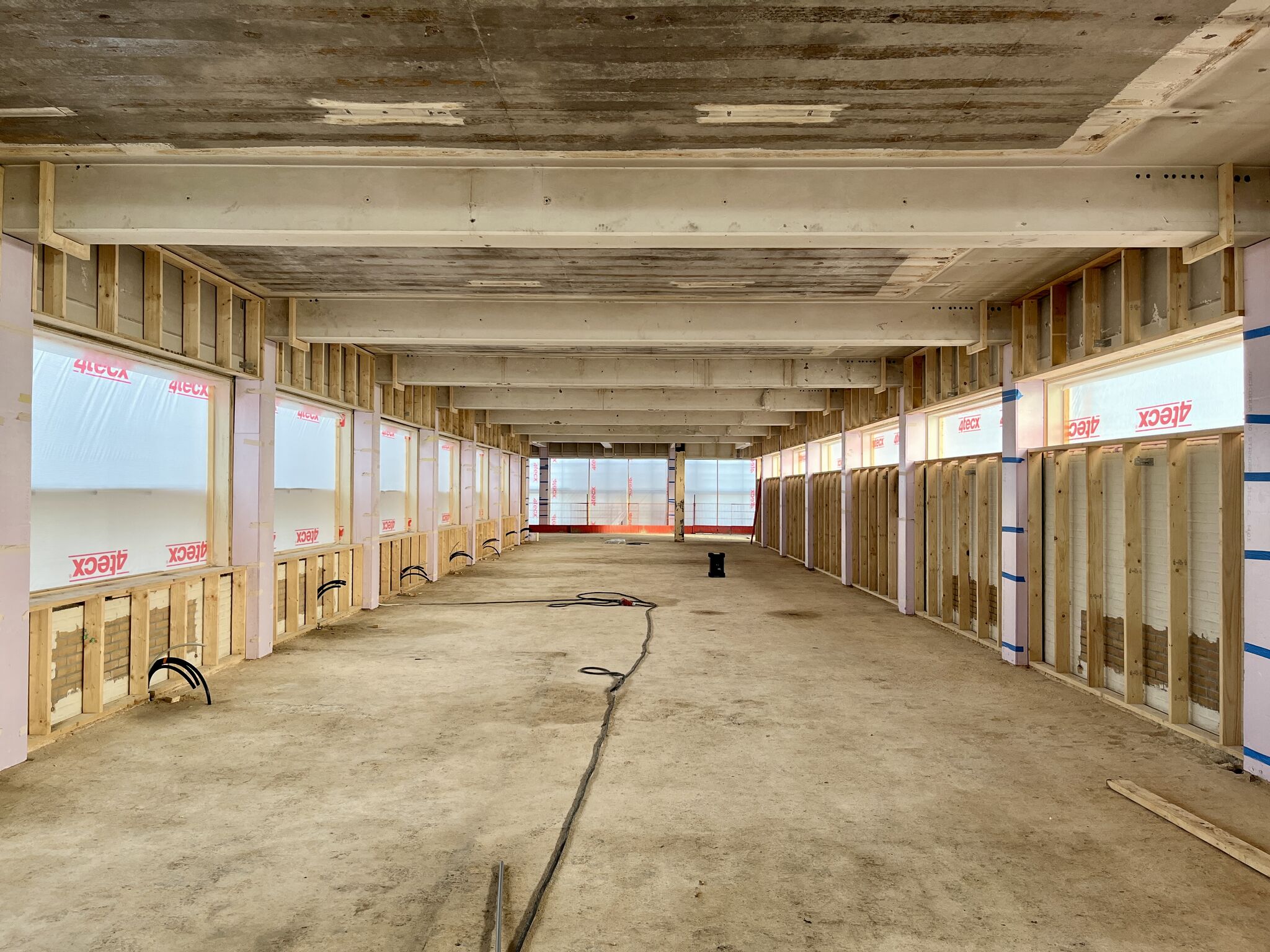 De oude stalen kozijnen zijn verwijderd en maken plaats voor aluminium kozijnen in steellook. Ondertussen is de begane grondvloer gerenoveerd en geïsoleerd en ligt de verdiepingsvloer er ook in.